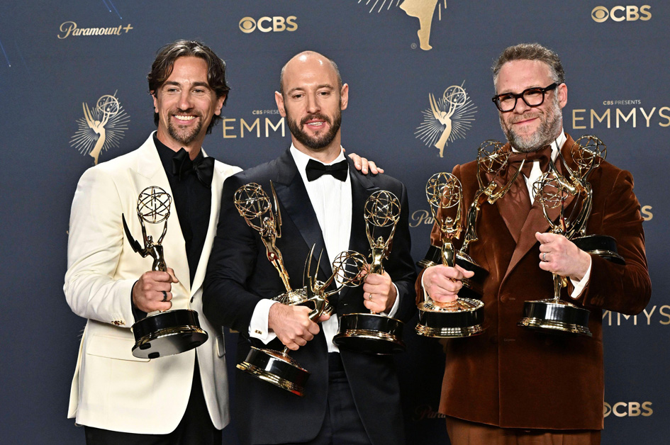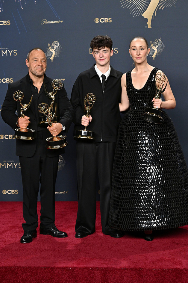 Hannah Einbinder and Jean Smart posed together on the 77th Primetime Emmy Awards photocall after winning the Emmy for Best Actress in a Comedy Series for their roles in the hit series Hacks.Cristin Milioti proudly brandishing her Emmy for Best Lead Actress in a Miniseries for her role in The Penguin.On September 14, 2025, at the prestigious Peacock Theater in Los Angeles, Katherine LaNasa and Noah Wyle were honored during the 77th Primetime Emmy Awards winners photocall, each receiving a statuette for their performance in the acclaimed drama series “The Pitt.”James Weaver, Evan Goldberg and Seth Rogen proudly posed for the photocall of the 77th Primetime Emmy Awards winners, after winning the Emmy for Best Comedy Series for their creation: The Studio.In West Hollywood, Britt Lower made a remarkable entrance. Winner of the award for Best Lead Actress in a Drama Series for her role in Severance, she appeared dressed in a personalized Calvin Klein, combining minimalist elegance and contemporary boldness.Stephen Graham, Owen Cooper and Erin Doherty, each proudly holding their Emmy for the acclaimed drama miniseries «Adolescence»