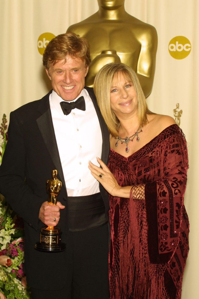 Hollywood, California, Oscars 2002 Actor and director Robert Redford, along with the singer Barbra Streisand, are in the newsroom at the 74th annual Academy Awards.
