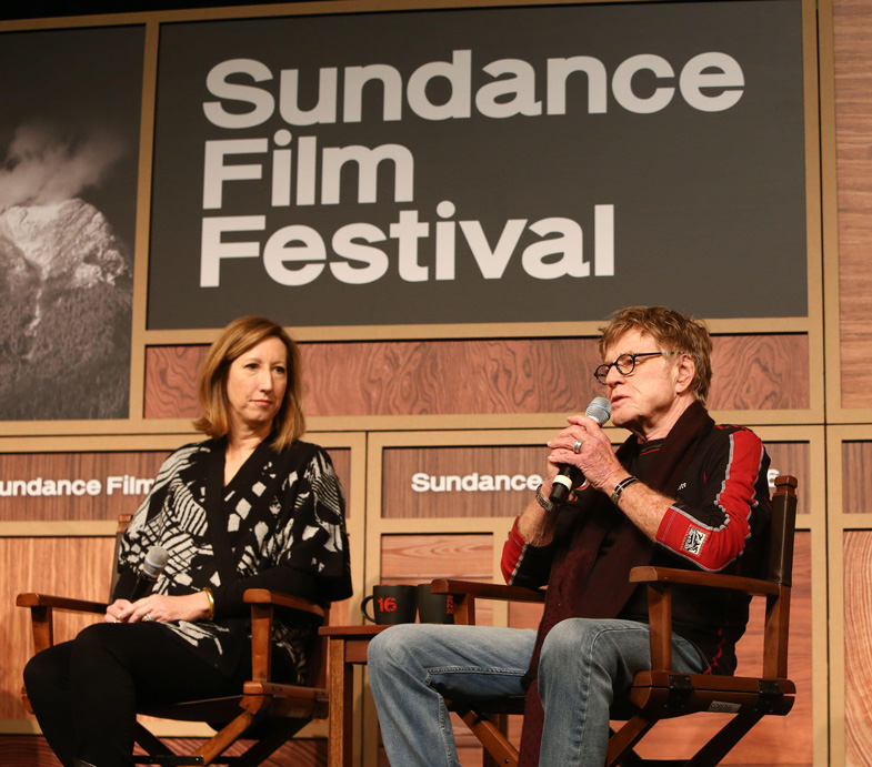Park City, Utah, USA – Keri Putnam, director of the Sundance Institute, and Robert Redford, president of the Sundance Institute, are attending the press conference on the first day of the Sundance 2016 film festival at the Egyptian theater.